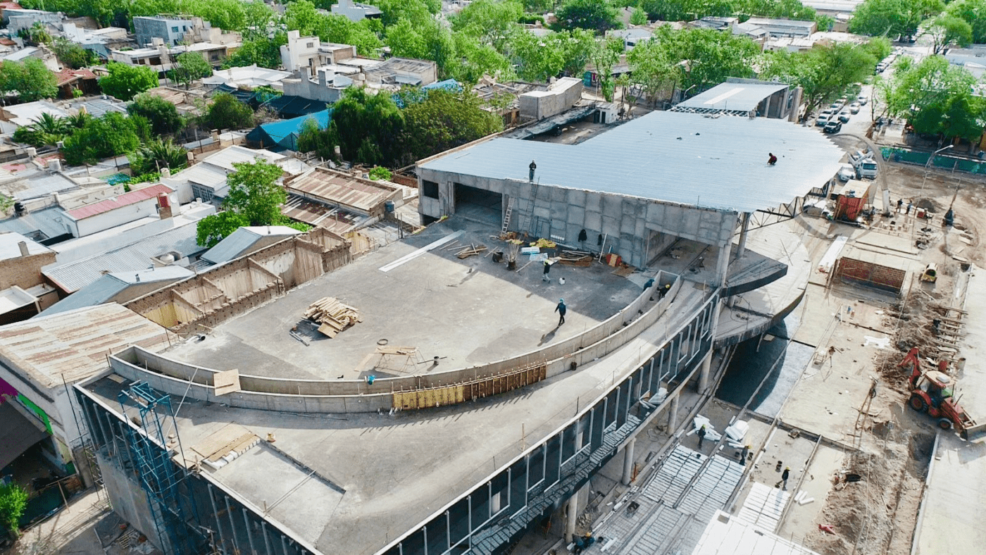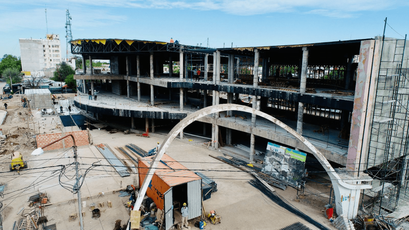 Allí sigue avanzando el edificio que tendrá uso administrativo, comercial y cultural, además de espacio público para quienes usan el colectivo entre la ciudad y los distritos.
