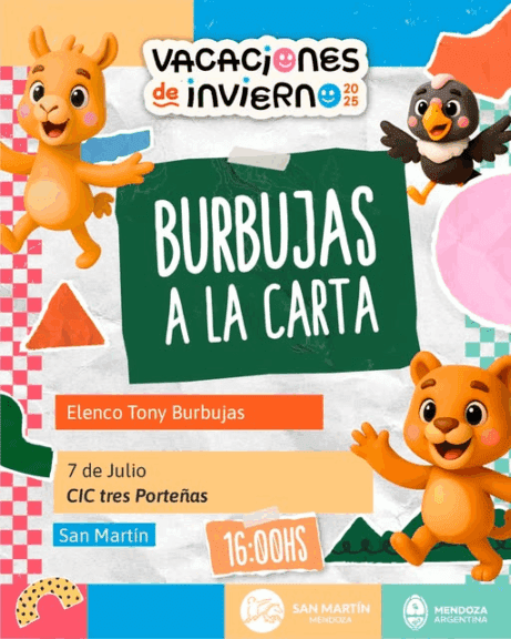Comienzas las vacaciones de invierno y la Dirección de Cultura de la comuna de Gral. San Martín invita para esta tarde, a las 16, en el CIC de Tres Porteñas a disfrutar de la obra “Burbujas a la carta”, del elenco Tony Burbujas. La entrada es libre y gratuita.