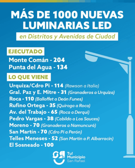 En una tarea conjunta con la cooperativa del distrito las luces led ya iluminan la rotonda de acceso, tramos de las rutas 171 y 146, Plaza Belgrano, el predio de San Expedito, el Paseo de Los Pioneros, el Parque Infantil y el bulevar de calle Belgrano. También se colocaron 28 proyectores en el bulevar de la avenida Mendoza y la pasarela de la ex estación ferroviaria.