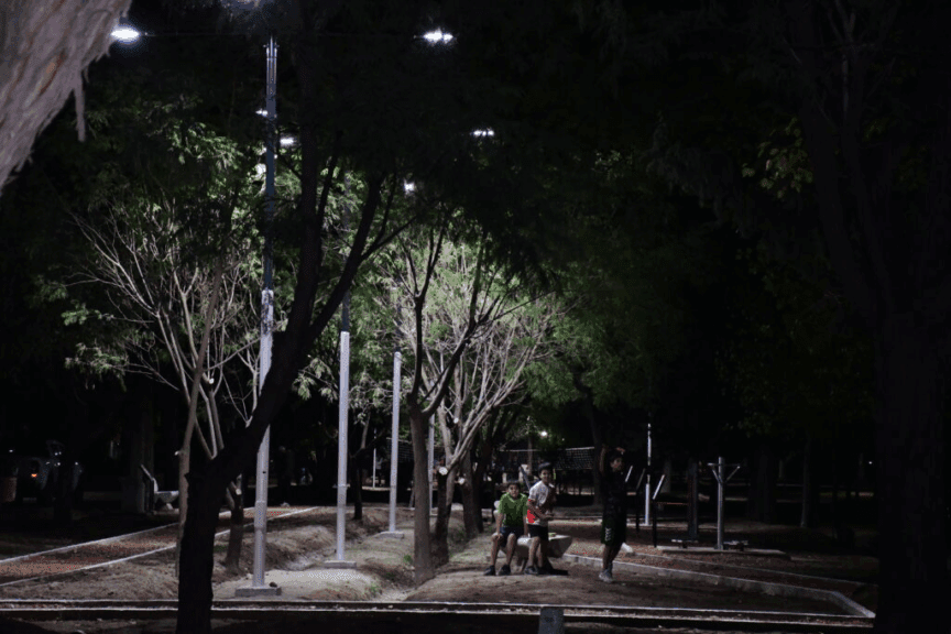 Sector N.º 3 – Área de Paseo, Recreación y Churrasqueras: Se construyeron cuatro churrasqueras con mesas y asientos de mampostería y hormigón, junto con más bancos, papeleros y luminarias LED. Este sector está diseñado para ser un espacio de encuentro y recreación para toda la familia.