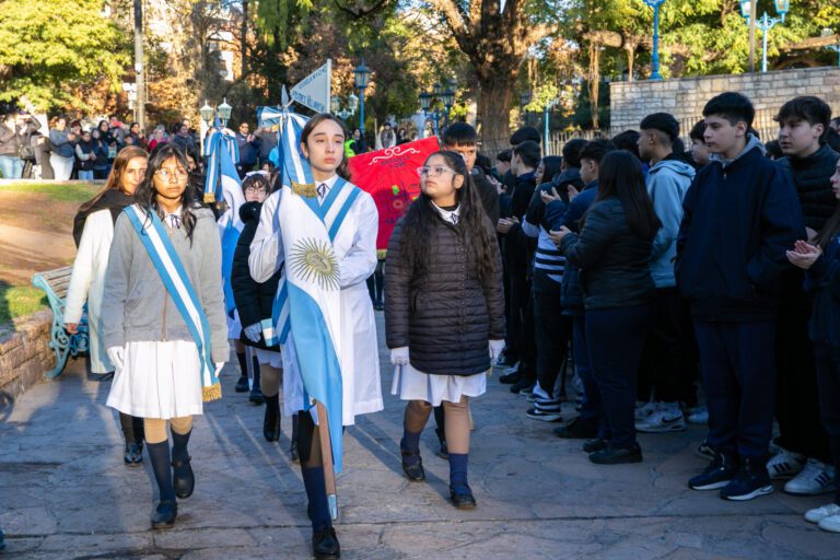 Enmarcados en la pintoresca y emblemática plaza Independencia, con su fuente de agua teñida de celeste, las Banderas de Ceremonia ingresaron a escena para ser los estudiantes, los protagonistas del acto. Adriana Yenaropulos tomó la promesa de lealtad de nivel primario y Ulpiano Suarez fue quien tomó el juramento de fidelidad de nivel secundario.