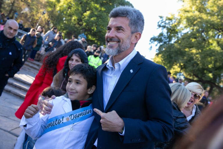 “La Bandera Argentina representa para nosotros la historia de nuestra tierra, la epopeya libertadora de San Martín y Belgrano y sus idearios de libertad. Simboliza el trabajo de nuestro pueblo, nuestros sueños y alegrías, nuestros dolores y el canto y la esperanza de un futuro aventuroso. Por eso juramos sostenerse con honor, honrando a nuestros antepasados y a todos los que dieron lo mejor de sí para que fuéramos una nación libre, grande y soberana. Juramos amarte y serte fieles siendo mejores hijos, buenos estudiantes, leales amigos y mejores personas. Juramos defenderte, respetando la constitución y las leyes, luchando contra la injusticia para que todos podamos sentirnos orgullosos de vivir en una tierra donde sus habitantes gocen de la dignidad que como seres humanos se merecen. Digamos todos juntos: ¡Viva la patria!”, exclamó el intendente de los mendocinos ante las nueve instituciones educativas presentes en la plaza Independencia.