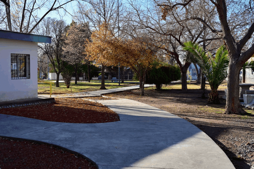 La obra contempló la construcción de senderos de hormigón y sectores internos, con tareas previas de nivelación, relleno y compactación del suelo. También, se incorporaron plataformas para bancos, mesas y ejercitadores. Así, se mejora la accesibilidad y comodidad de todos los usuarios.