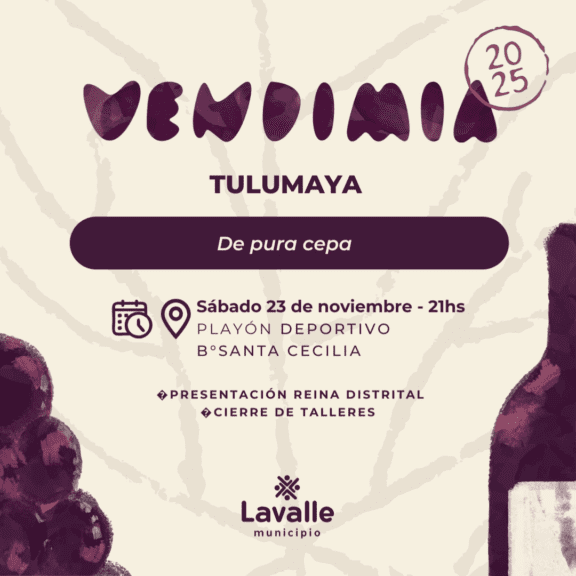 Este próximo sábado 23, en Tulumaya se vivirá la vendimia “De Pura Cepa”, que tendrá lugar en la plaza del B° Santa Cecilia, a partir de las 22hs, donde se conocerá a la candidata para representar a la villa cabecera del departamento.
