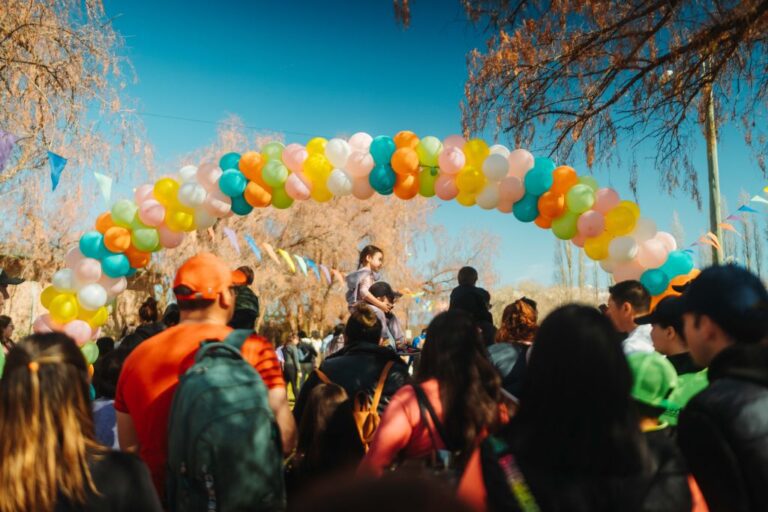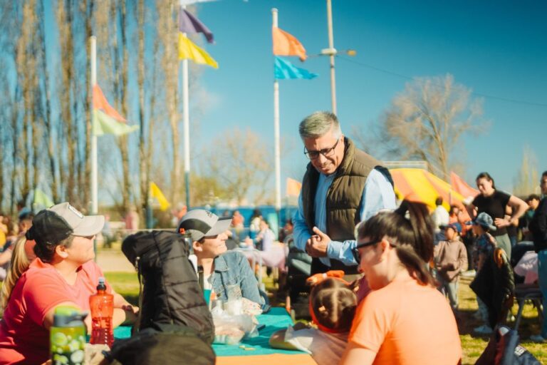 Adentro había un despliegue colorido, música, alrededor del campo de la pista de atletismo, decenas de inflables, juegos de emboque, pulso, puntería, kioscos tradicionales, pista inflable con autos, mini cafetería, bodega, hospital, legos y pelotero, en el lateral derecho la carpa circense, artesanos, foodtrucks y en el sector del playón deportivo externo plaza blanda para infancias con sensibilidad sensorial y una mini pista vial inflable. La zona de picnic se llenó de familias merendando.