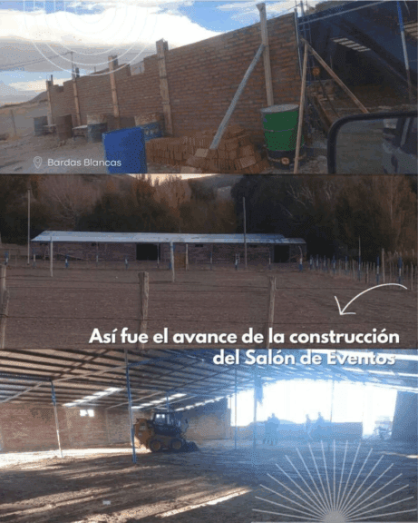 En cuanto a la localidad de Bardas Blancas, se observa el gran avance de la construcción del Salón de Eventos, obra esperada por todos los lugareños para unificar los espacios de deportivos, culturales y sociales.