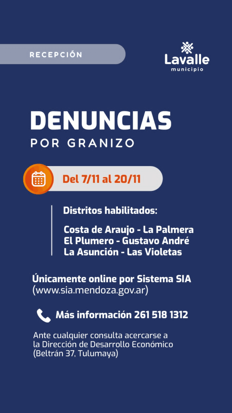 Hasta el 20 de noviembre, los productores de los distritos Costa de Araujo, La Palmera, El Plumero, Gustavo André, La Asunción y Las Violetas afectados por la tormenta del pasado 6 de noviembre, podrán realizar sus denuncias por daños ocasionados por granizo.