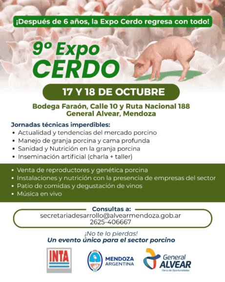 Tras seis años de ausencia, regresa una de las actividades más esperadas por el sector agroindustrial del sur mendocino. La 9ª edición de la Expo CERDO se desarrollará los días 17 y 18 de octubre en el predio de Bodega Faraón, ubicado en Calle 10 y Ruta Nacional 188, y promete convertirse en un punto de encuentro clave para productores, técnicos, empresas y público general.