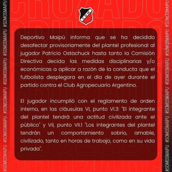 Deportivo Maipú ha tomado la decisión de separar temporalmente al defensor Patricio Ostachuk del equipo profesional, tras un altercado verbal con un aficionado en el partido contra Agropecuario.