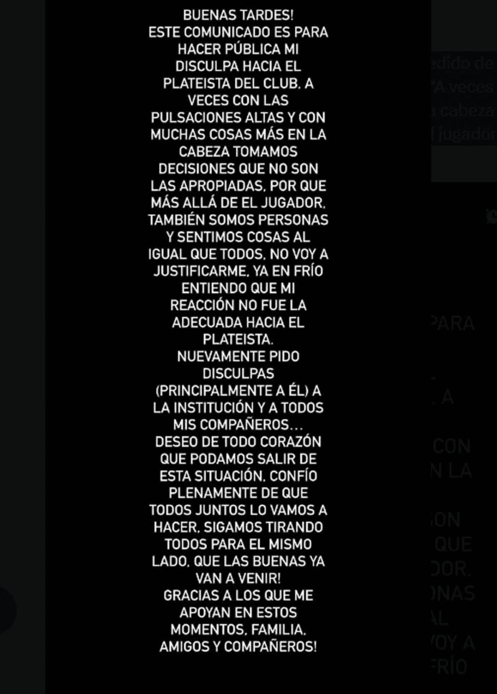 En respuesta a la acción del club, Ostachuk se disculpó públicamente en las redes sociales, reconociendo que las decisiones tomadas en momentos de alta tensión no siempre son las correctas y recordando que, más allá de ser jugadores, también son seres humanos susceptibles a errores.