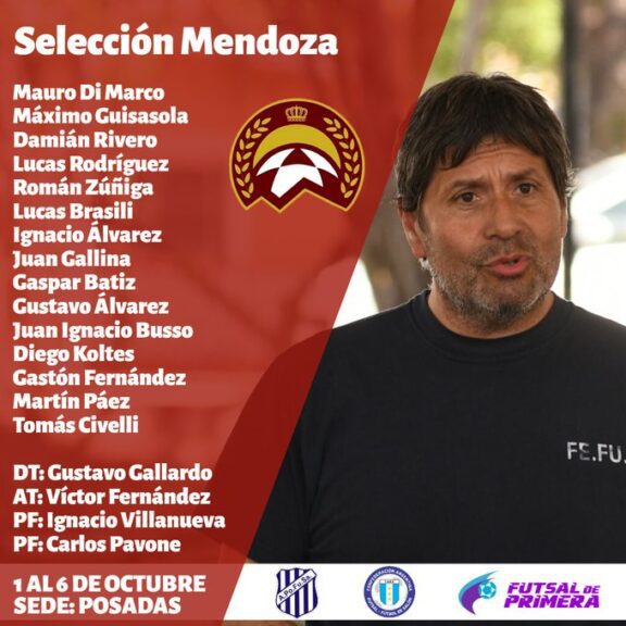 El equipo masculino de futsal de la provincia de Mendoza, bajo la dirección del estratega Gustavo Gallardo, anunció su lista de 15 jugadores para competir en el torneo nacional de selecciones en Posadas, la capital de Misiones . El conjunto mendocino buscará una hazaña sin precedentes al conquistar su séptimo título argentino de forma consecutiva en este torneo, que se llevará a cabo desde el próximo domingo hasta el viernes 6 de octubre y es organizado por la Confederación Argentina de Futbol de Salón ( CAFS).