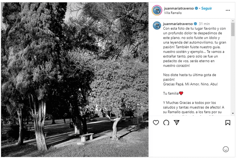 Fue desde la cuenta personal en Instagram del ex corredor, “@juanmariatraverso”, que su familia quiso hacerle el último homenaje. Para ello, eligieron una postal muy especial para acompañar el emotivo texto: “Con esta foto de tu lugar favorito y con un profundo dolor te despedimos de este plano, no solo fuiste un ídolo y una leyenda del automovilismo, tu gran pasión. También fuiste nuestro guia, nuestro sostén y ejemplo… ¡Te vamos a extrañar tanto, pero solo se fue un pedacito de vos, serás eterno en nuestro corazón! ¡Nos diste hasta tu última gota de pasión! ¡Gracias Papá, Mi Amor, Nino, Abu! Tu familia”, postearon generando que miles de personas dejaran su comentario de profundo cariño al hombre que marcó a distintas generaciones.