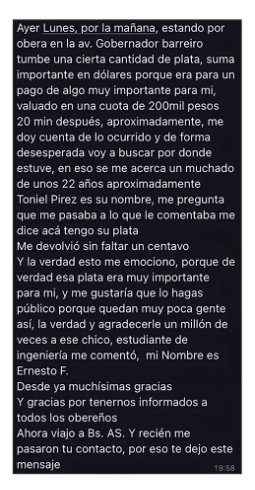 Lo cierto es que con el fajo había un ticket, donde figuraba un nombre. Toniel decidió regresar al lugar donde estaba la plata (que según se supo después, equivalía a 200 mil pesos) y vio a un grupo de personas buscando algo. Conversando con la gente, encontró el momento justo para preguntar el nombre de la persona que se veía más desesperada. Coincidiendo con el de ticket, entregó el fajo.