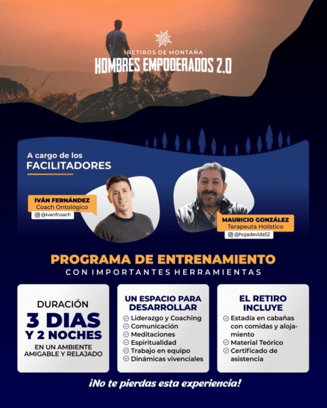 Un Retiro de Montaña especialmente dirigido a hombres de Argentina y otros países que tienen la valentía y la voluntad de querer sanar sus heridas emocionales, aceptar su vulnerabilidad, reconocer y superar sus limitaciones e ir en busca de una versión más empoderada de si mismos.