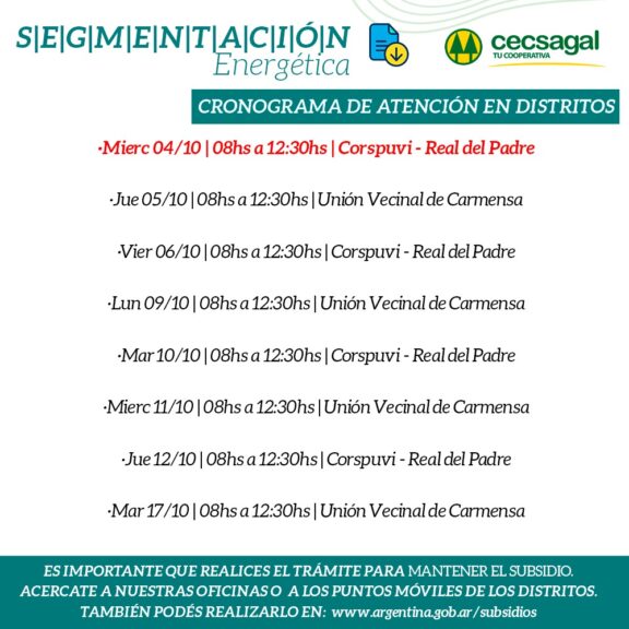 En un esfuerzo por simplificar el proceso de Segmentación Eléctrica dictado por el Gobierno Nacional, la Cooperativa Cecsagal se embarcará en un operativo destinado a los barrios y distritos de General Alvear y alrededores, incluyendo Real del Padre y Carmensa, entre otros.