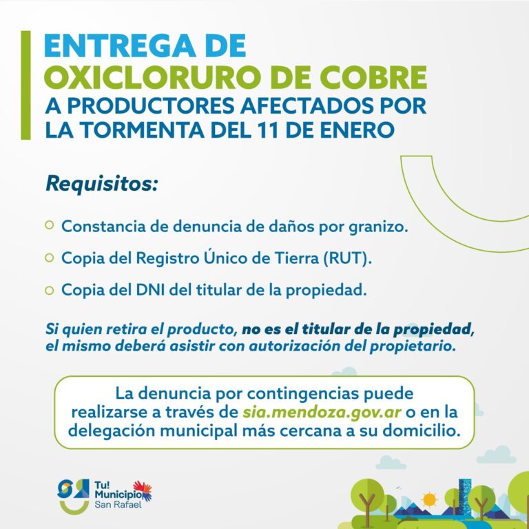 Para retirar el oxicloruro de cobre, se requerirá una constancia de denuncia de daños por granizo, una copia del Registro Único de Tierra (RUT) y una copia del DNI del titular de la propiedad. En caso de que el retirante no sea el propietario, deberá contar con la correspondiente autorización.