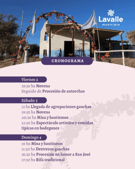 El calendario de actividades comenzará el día viernes 2 de mayo con la Cabalgata desde la plaza departamental a San José a las 8:00h, y a las 19:30h tendrá lugar el rezo de la novena, seguido de la emotiva procesión de antorchas que iluminará la noche lavallina, marcando el inicio de las festividades.