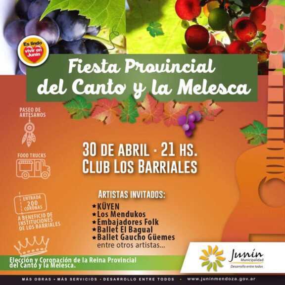 Los amantes de los festivalds tendrán una nueva oportunidad de disfrutar el domingo 30 de abril cuando se lleve a cabo una nueva edición de la Fiesta Provincial del Canto y la Melesca en el Club Los Barriales. En esta ocasión, la celebración contará con la elección y coronación de la Reina Provincial, así como con la presentación de destacados artistas.