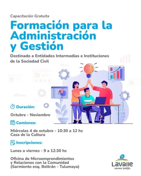 La otra capacitación está apuntada a la Formación para la Administración y Gestión. Dirigido a entidades intermedias e instituciones de la sociedad civil, este taller ofrece la oportunidad de adquirir, profundizar y actualizar conocimientos esenciales para mejorar la gestión de organizaciones. Se abordarán temas relacionados con la administración, contabilidad y aspectos legales, lo que permitirá una gestión más eficaz y eficiente.