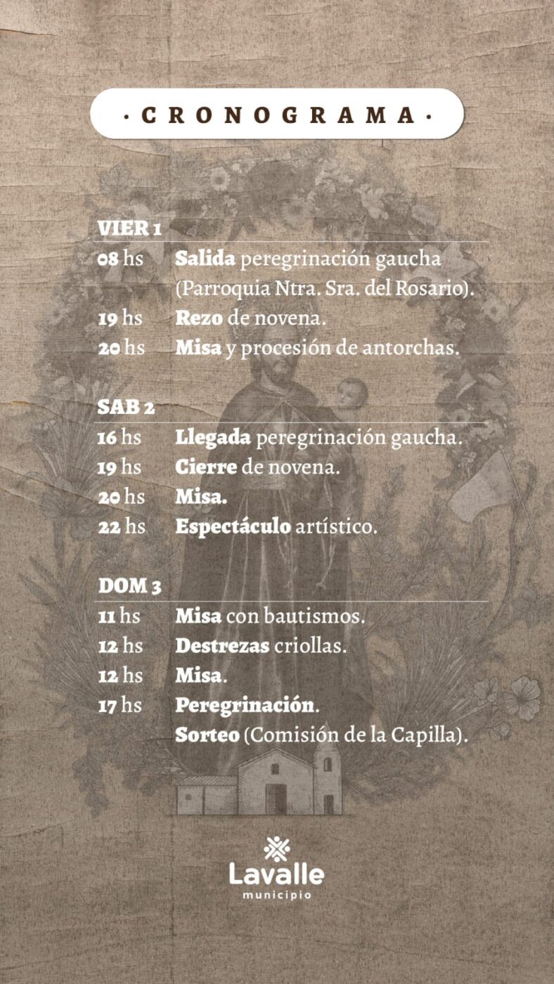 Las actividades comenzaron con el rezo de la novena, en preparación para los días centrales de la festividad. Cabe destacar que, el evento inicia el calendario de fiestas patronales del departamento , con propuestas culturales: El viernes 1 de mayo, a las 08:00 hs, partirá la peregrinación gaucha desde la Parroquia Nuestra Señora del Rosario. Por la tarde, a las 19:00 hs, se realizará el rezo de la novena, y a las 20:00 hs tendrá lugar la misa seguida de una procesión de antorchas.