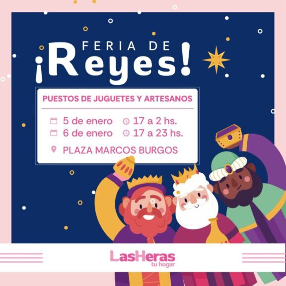 Será este viernes 5 de enero de 17 a 2hs y el sábado 6 de 17 a 23hs. en la plaza Marcos Burgos de Las Heras (Rivadavia y San Miguel) donde están los puestos de juguetes y artesanos con la gran “Feria de Reyes” que cada año, atrae a las familias en busca de la magia después de la Navidad.