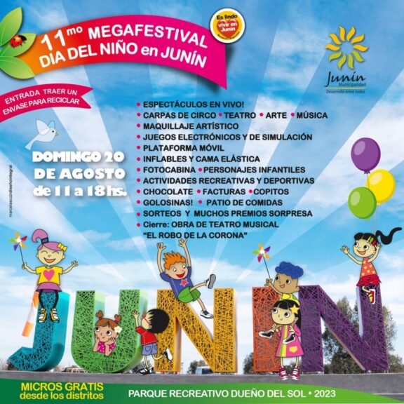 En un esfuerzo conjunto entre la Municipalidad de Junín y diversos distritos, se anunció con entusiasmo la próxima edición del Megafestival Día del Niño. El evento se llevará a cabo el domingo 20 de agosto en Parque Recreativo Dueño del Sol, extendiéndose desde las 11 de la mañana hasta las 18 horas.