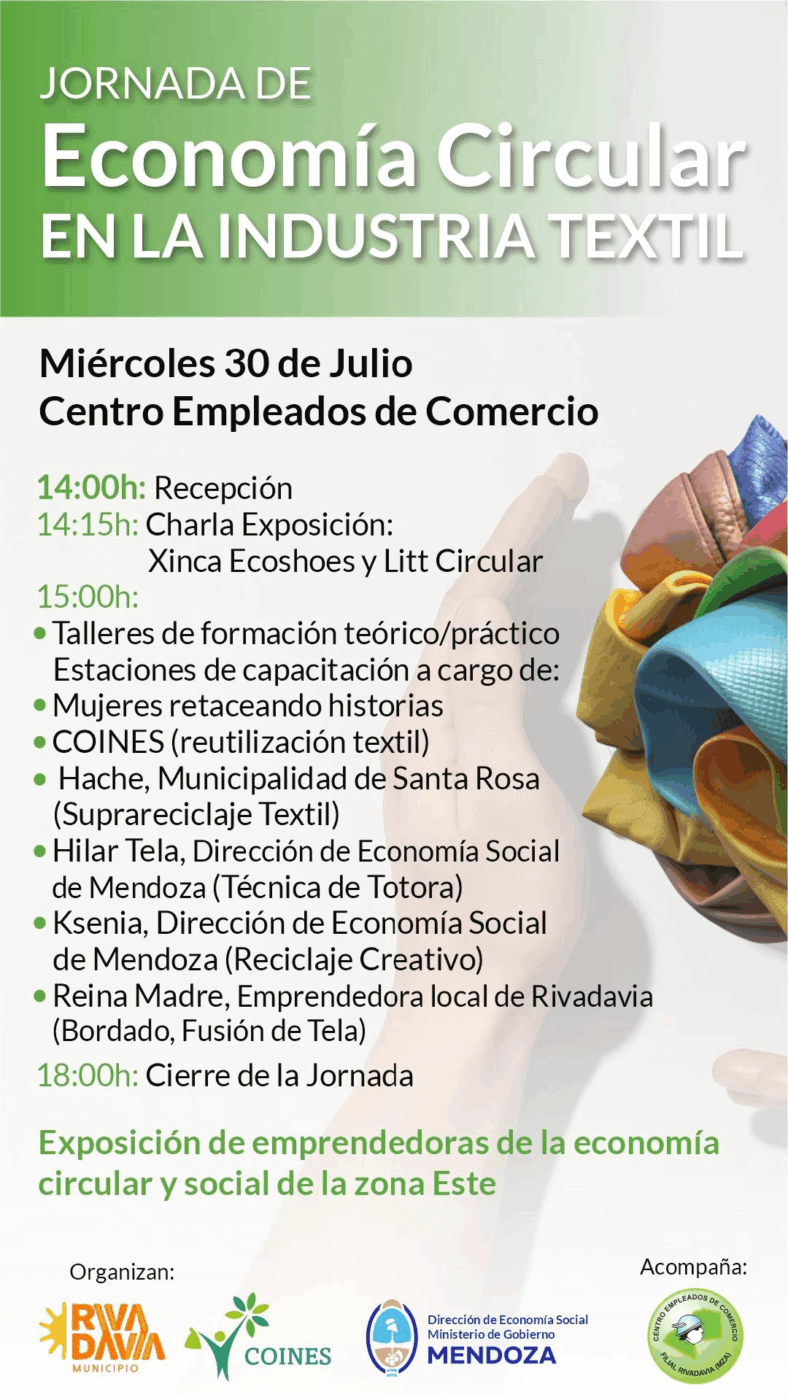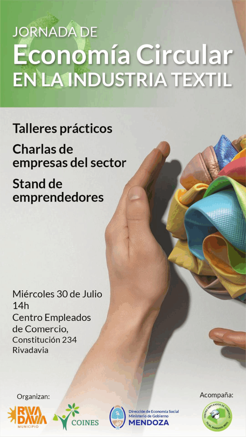 La Municipalidad de Rivadavia, en conjunto con COINES y la Dirección de Economía Social del Ministerio de Gobierno de Mendoza, invita a participar de la Jornada de Economía Circular en la Industria Textil, que se realizará el miércoles 30 de julio a partir de las 14:00 h en el Centro de Empleados de Comercio ubicado en Constitución 234, Rivadavia.
