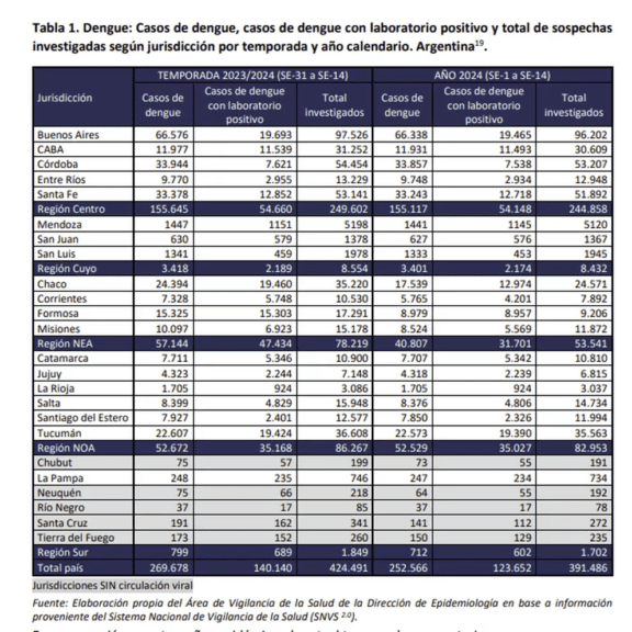 El Ministerio de Salud de la Nación dio a conocer los últimos datos sobre la incidencia del dengue en Argentina. ”En términos acumulados se han notificado desde la semana 31 de 2023 -fines de julio y comienzos de agosto- hasta la semana 14 de 2024 -principios de abril-) 269.678 casos de dengue (90% autóctonos, 7% en investigación y 3% importados), de los cuales 252.566 corresponden 2024″.