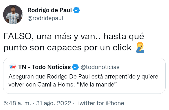 Lo hizo mediante su cuenta de Twitter y con un contundente mensaje: “Falso, una más y van… hasta qué punto son capaces por un click” twitteo el jugador desmintiendo los rumores que comentaban que Rodrigo habria dicho en su intimidad que estaba arrepentido de dejar a su expareja Camila Homs y que tenia intenciones de volver con ella.