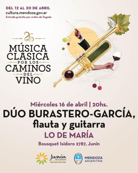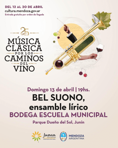 En el marco del 25° aniversario de Música Clásica por los Caminos del Vino, uno de los eventos culturales más emblemáticos de Mendoza, el departamento de Junín será sede de dos presentaciones destacadas, organizadas por la Secretaría de Cultura de Mendoza y con el auspicio de la Municipalidad de Junín.