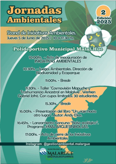 Las actividades comenzarán el jueves 5 de junio a las 10:00 horas en el Polideportivo Malal Hue, con el Concurso de Iniciativas Ambientales titulado “Talento Malargüino por el Buen Vivir”, que reunió más de 20 propuestas provenientes de distintos niveles educativos. Un jurado evaluará los trabajos y los ganadores serán anunciados el día viernes 6.